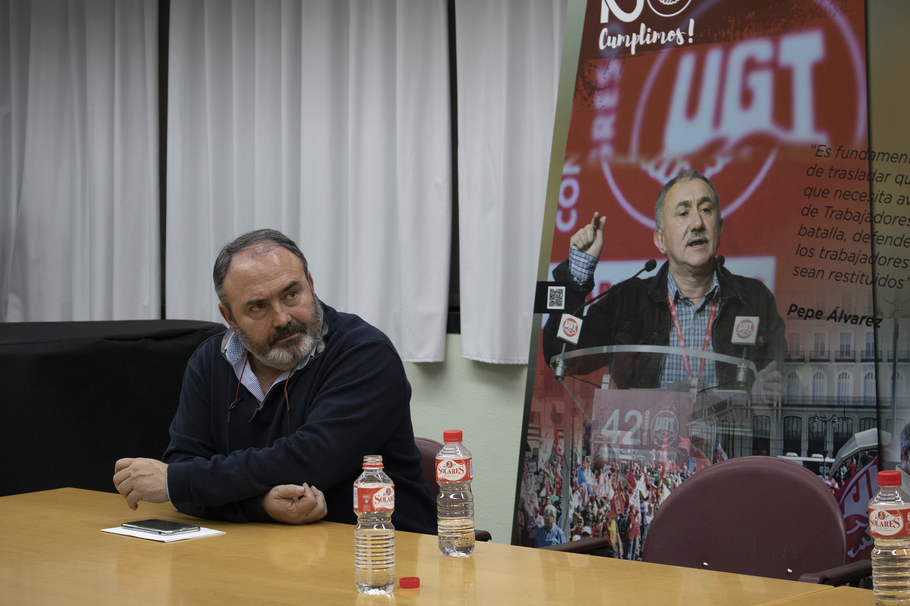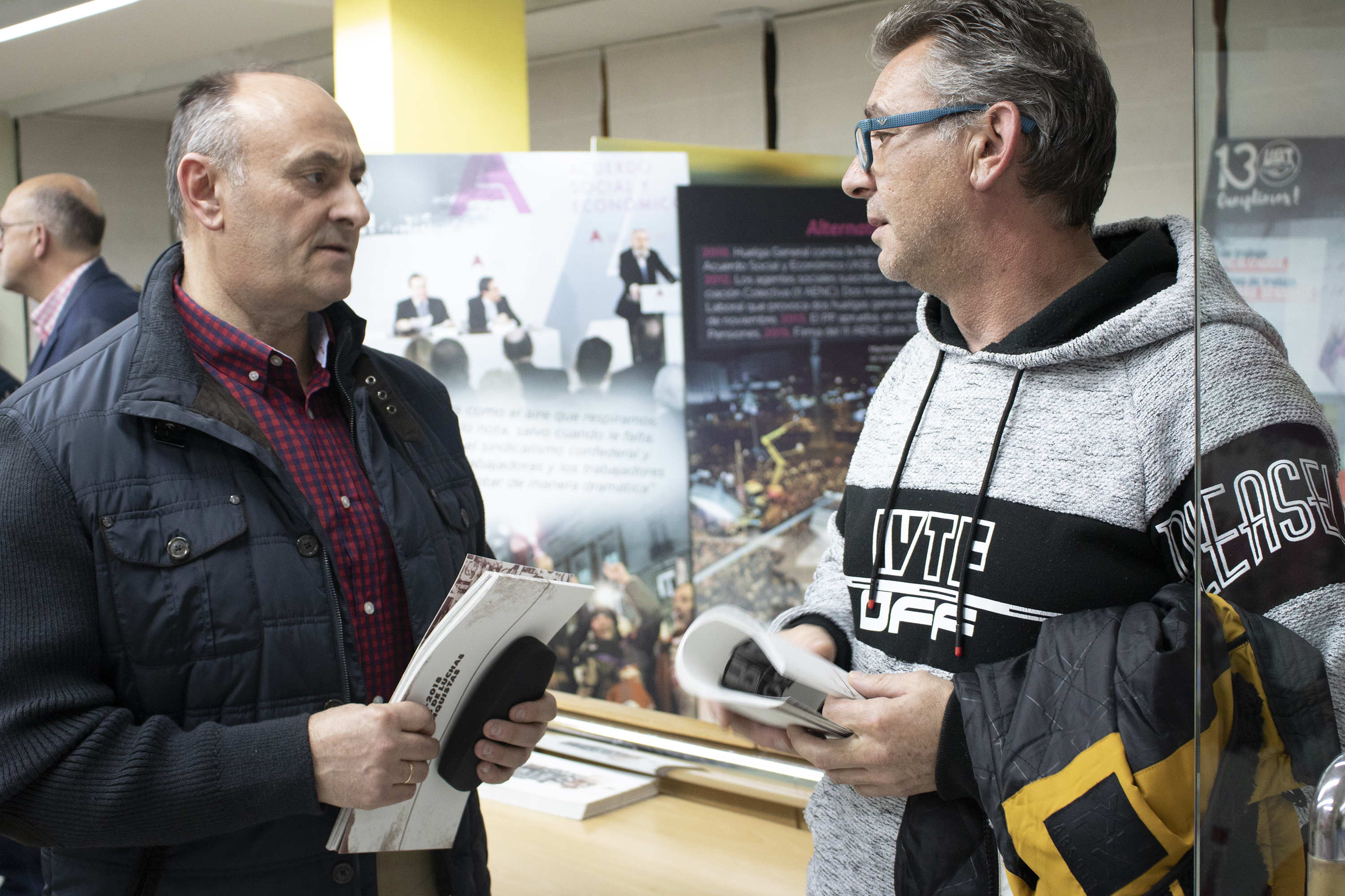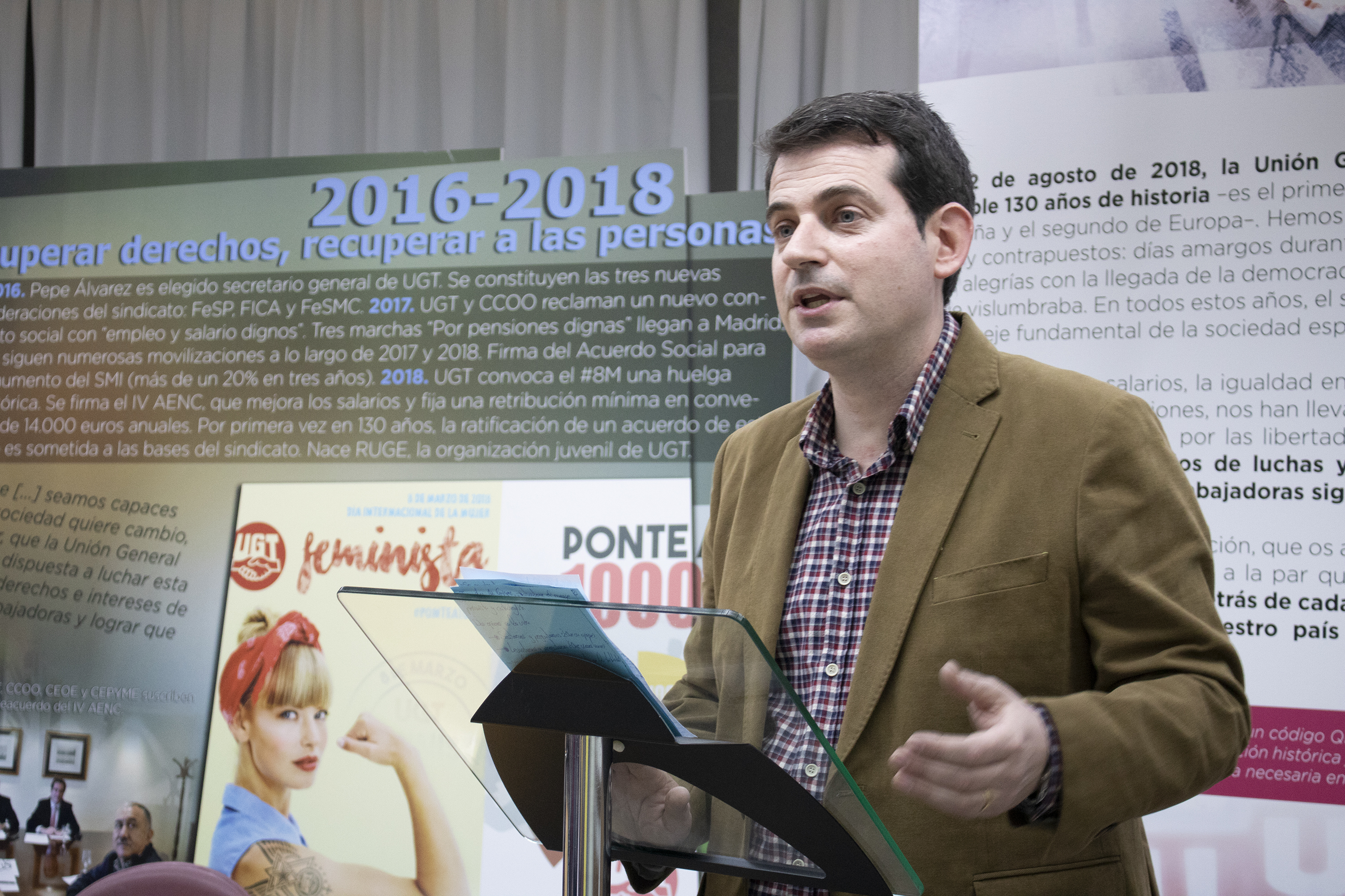 El secretario general de Cuenca, Jose Azcoitia, y el secretario general de UGT CLM, Carlos Pedrosa, inauguraron ayer la exposición en un acto al que asistieron numerosos sindicalistas y miembros del PSOE conquense y castellano manchego