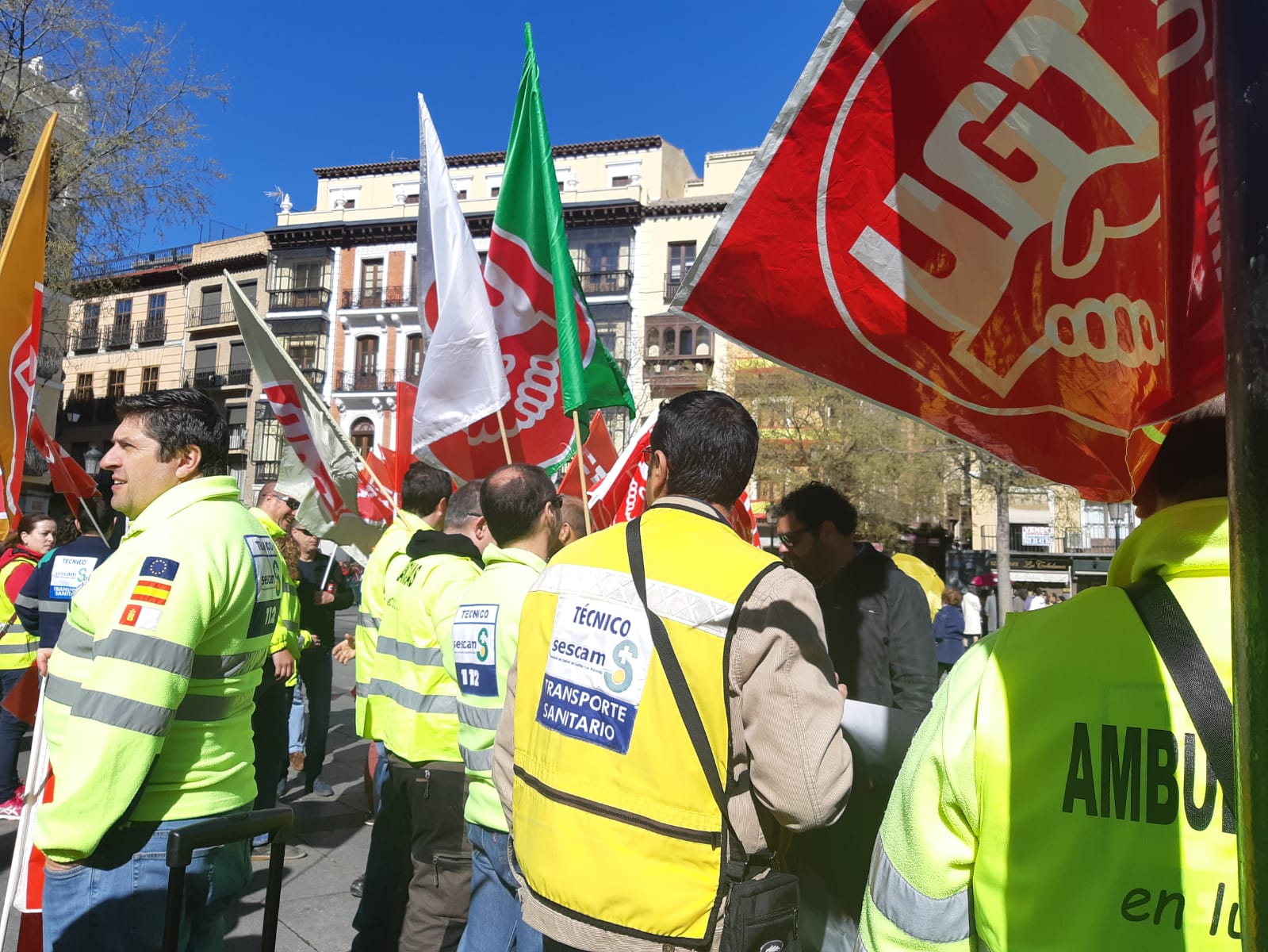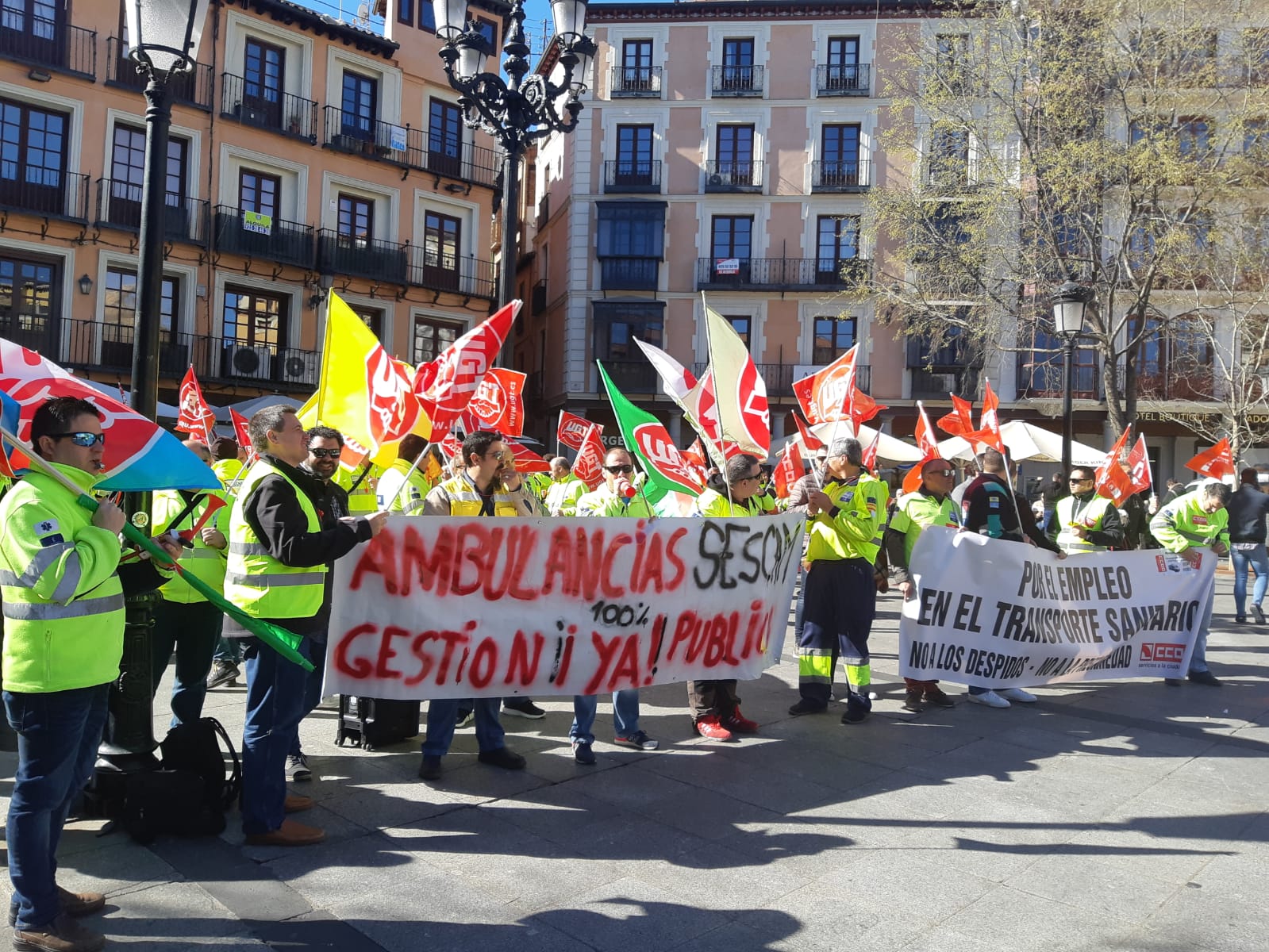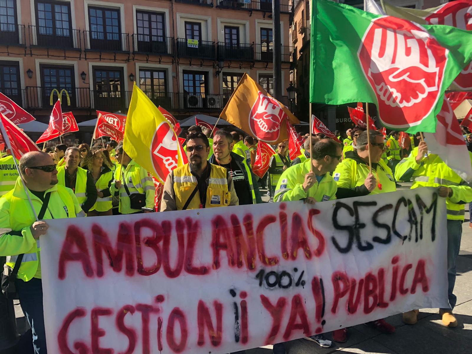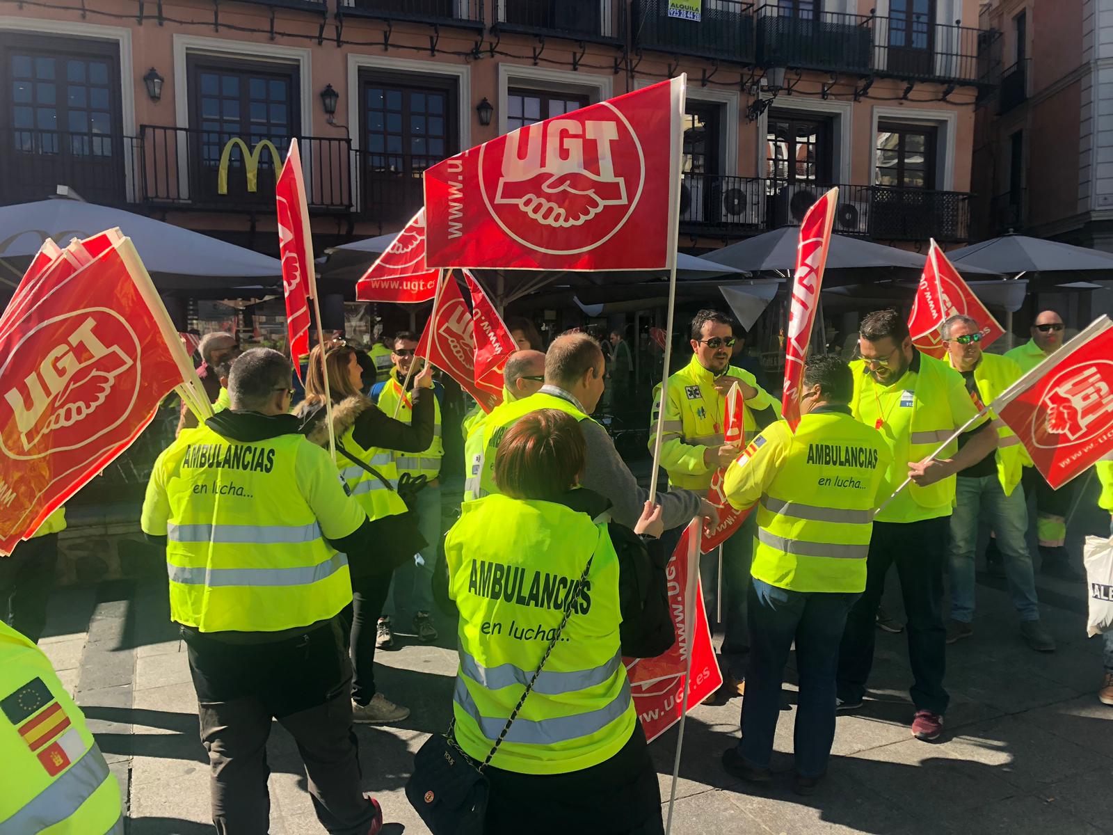 Unos trescientos trabajadores de las ambulancias de CLM convocados por el sector Sanidad de FeSP UGT CLM y CCOO se han manifestado hoy en Toledo desde la Plaza de Zocodover hasta la Plaza de Toros para exigir la vuelta a las negociaciones del convenio de transporte sanitario de ambulancias y denunciar las condiciones que el colectivo lleva soportando desde 2012.