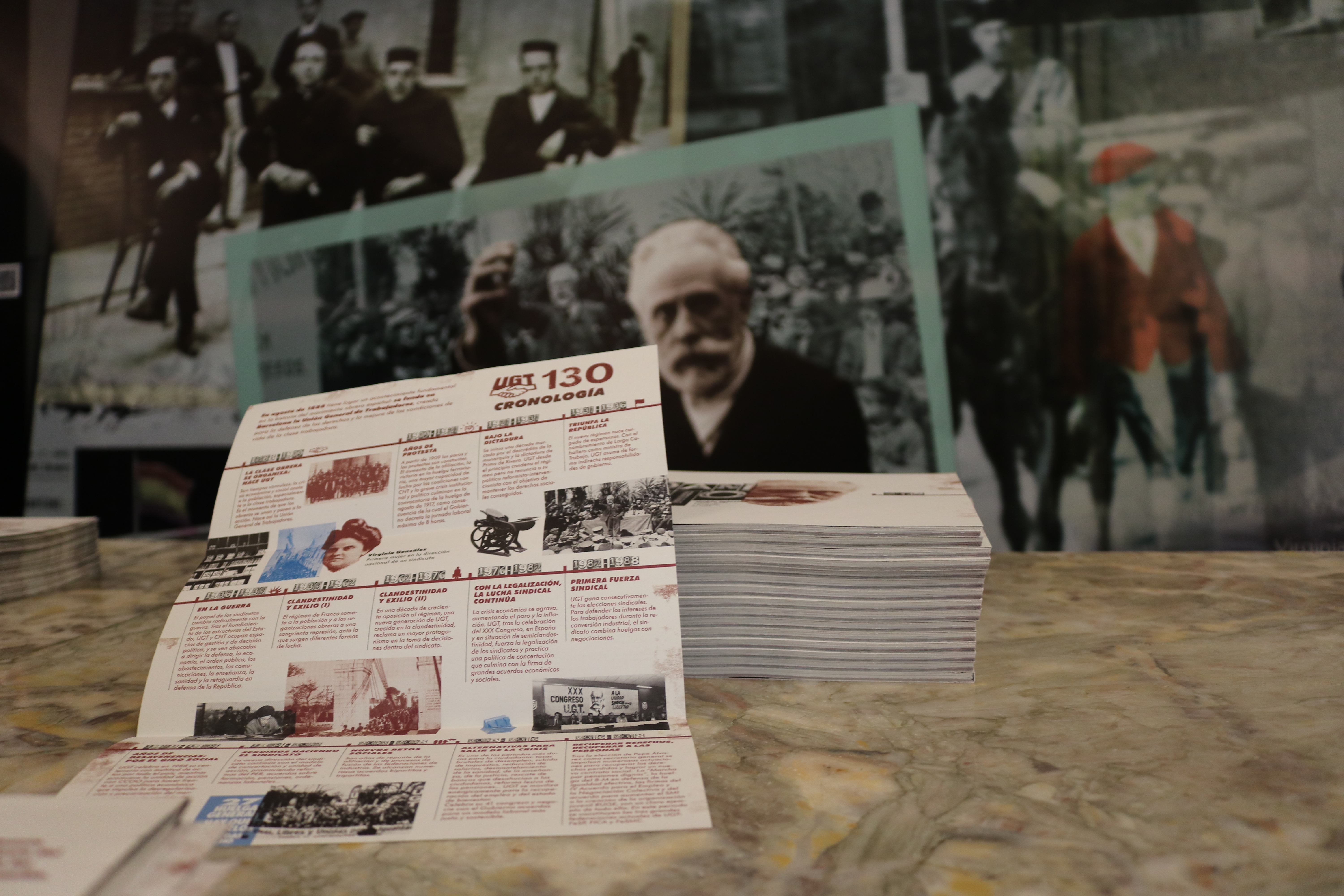 La exposición “130 años de Conquistas y Luchas” está recorriendo toda España desde agosto y consta de 20 paneles, 14 de ellos de carácter histórico y 6 temáticos, que recogen los principales logros del sindicato en momentos históricos como la dictadura de Primo de Rivera, la II República, la Guerra Civil, la dictadura franquista con el exilio de UGT y los años 80 y 90 de la democracia.